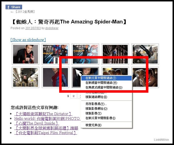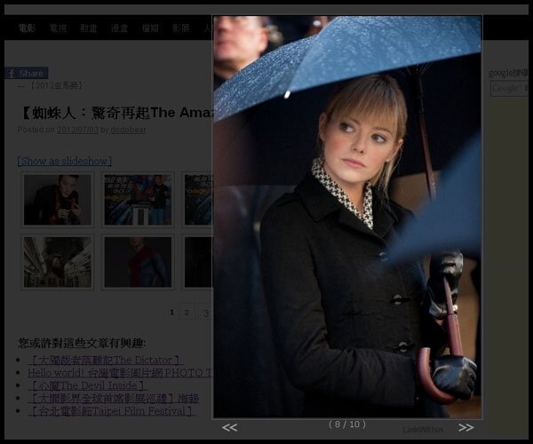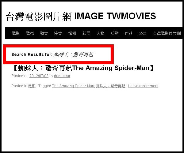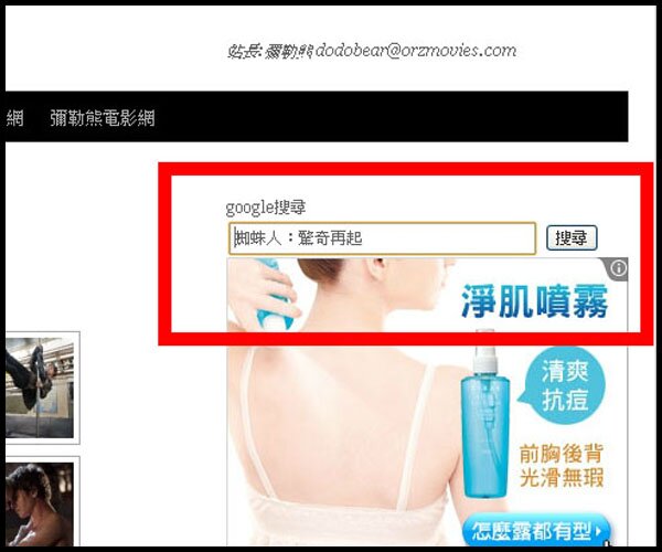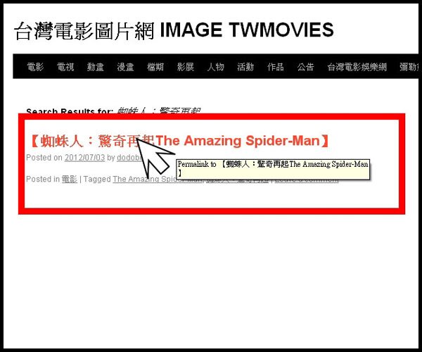 2.以你要搜尋的電影圖片為例:如【蜘蛛人:驚奇再起The Amazing Spider-Man】你可鍵入相關任何短或長的 keyword 關鍵字即可。有右上的 google 版 與右下的站內兩種搜尋功能。