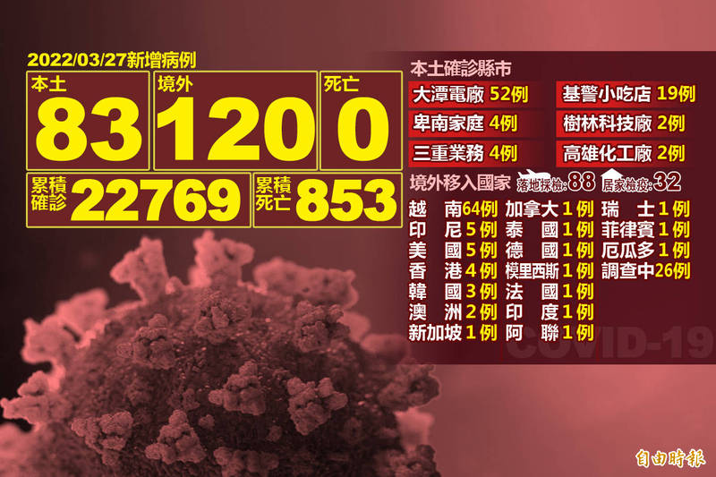 指揮中心統計,截至目前國內累計22769例確診,分別為7061例境外移入,15654例本土病例,36例敦睦艦隊、3例航空器感染、1例不明及14例調查中;無新增空號病例,累計135例移除為空號。